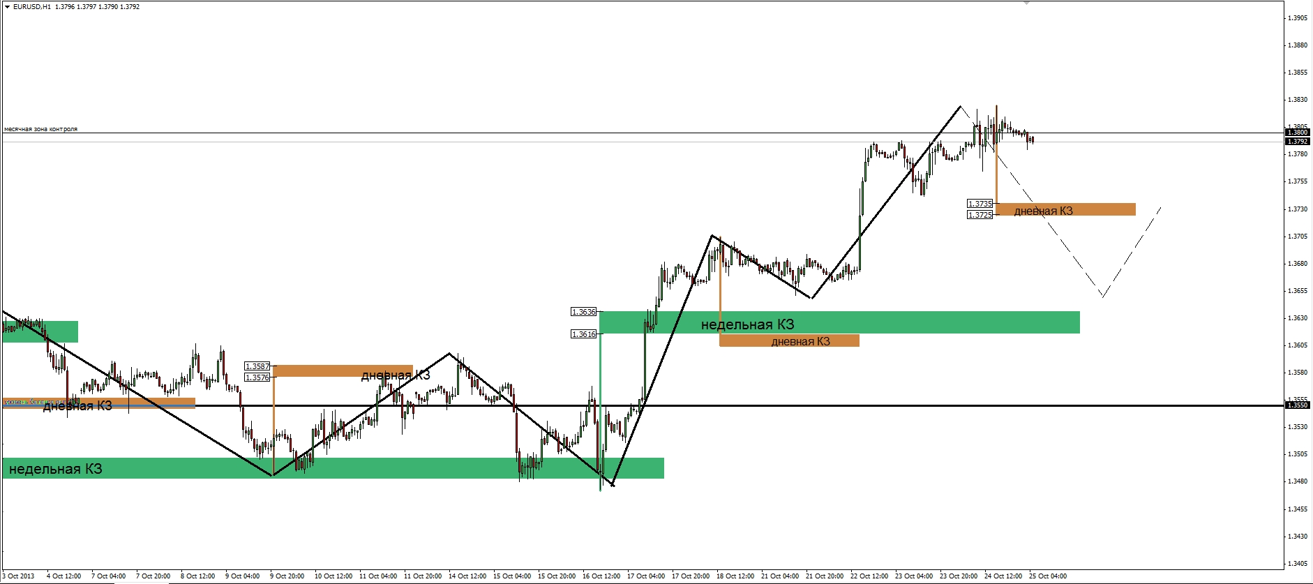 Приоритетная восходящая модель в течение текущей недели была исполнена на 100%. После закрепления выше уровня баланса 1.3550 на тестирование месячной зоны контроля 1.3800-1.3900 потребовалось всего 5 дней. На сегодняшний день курс тестирует уровень 1.3800, где наблюдается появление предложения. Как известно, месячная зона контроля является местом повышенного внимания со стороны продавцов опционов, поэтому любые признаки образования разворотной тенденденции нужно воспринимать со всей серьезностью.