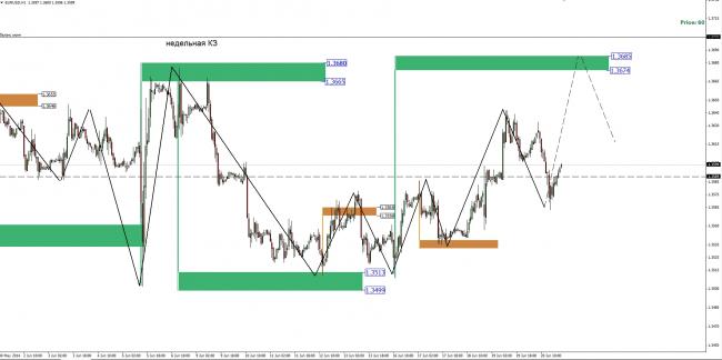 Альтернативной моделью будет модель, которая не позволит цене достичь июньского максимума. Обновление хая прошлой недели приведет к ложному пробою и возврату. Данная модель не имеет высокой вероятности, но математическое ожидание нисходящих сделок в текущих условиях позволяет рассматривать ее в качестве страховочного варианта. В течение недели может возникнуть ситуация, при которой цена пробьет балансовую отметку и закрепится выше. В этом случае необходимо менять стратегический рисунок, по причине начала доминации крупных продавцов. Все происходящее с курсом ниже уровня 1.3700 является компенсаторной моделью к последнему нисходящему движению прошлого месяца.