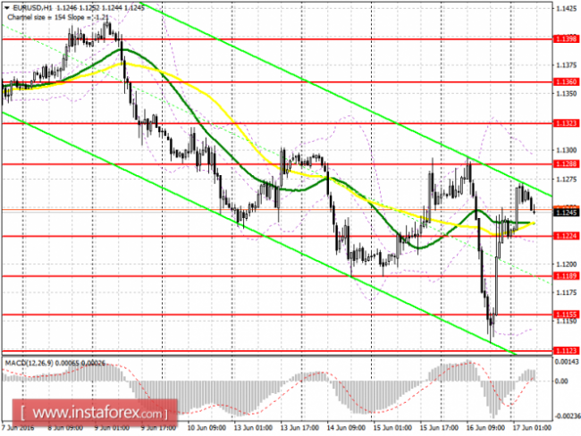 В результате сильного падения евро, торговля переместилась в нисходящий ценовой канал, нижняя граница которого расположилась в области минимума 14 июня -1.1188 и минимума вчерашнего дня 1.1130. Верхняя граница проходит у области максимума вчерашнего дня 1.1294.